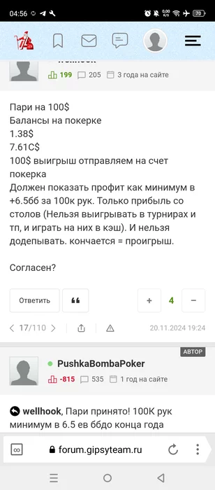 PushkaBombaPoker, для того что бы проиграть пари не обязательно иметь арбитраж , достаточно уважать своего соперника , быть мужчиной и призвать свои поражения с твоих же слов ты признал что бб на 100 меньше чем указано в пари , это факт пари проиграно нужно выплатить бабки.