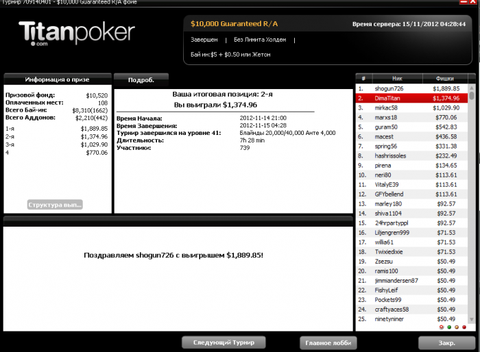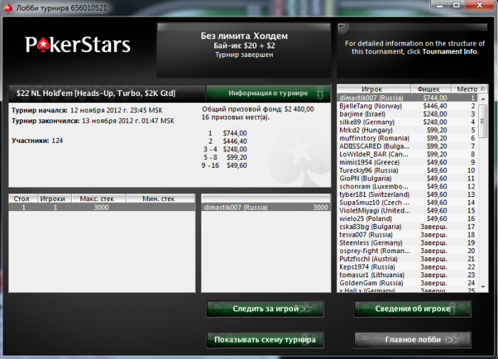По фишкам у оппа был явный перевес, но я подозревал что по хед-запу то я имею перевес, поэтому особо не отчаивался и в какой-то момент даже обошел оппонента по фикам , но увы на фоне усталости не сложилось! в итоге 2е место, такое обидное для HU игрока, и такое долгожданное в целом)