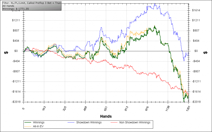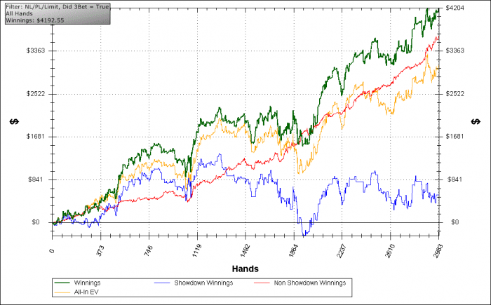Как ни странно, я зря жаловался на растущий в тильте 3-бет, все не так плохо, эти банки я хорошо понимаю. Общий 3-бет у меня 28%.