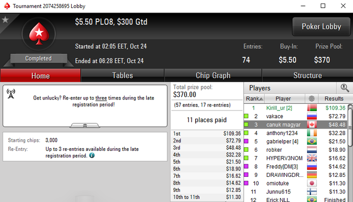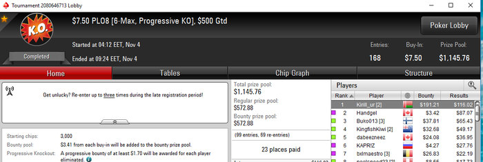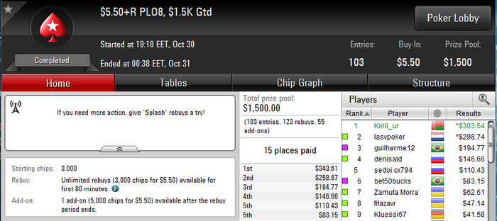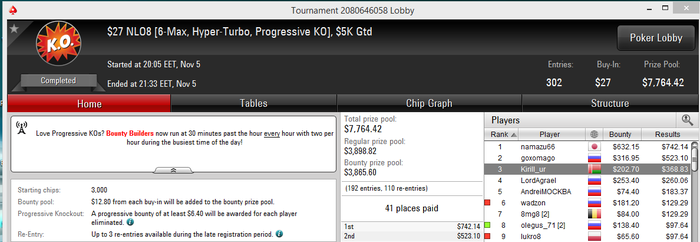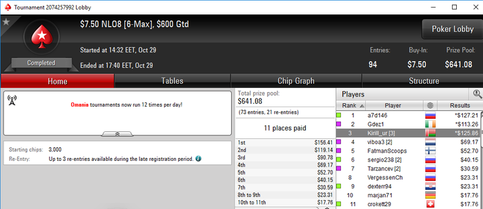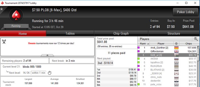 Обидный недоезд, чиповал с четырёх столов. Но последние два самых важных олл-ина, общей стоимостью $600 проиграл. Но игрой доволен, чувствую, что возвращаюсь в форму