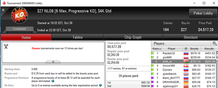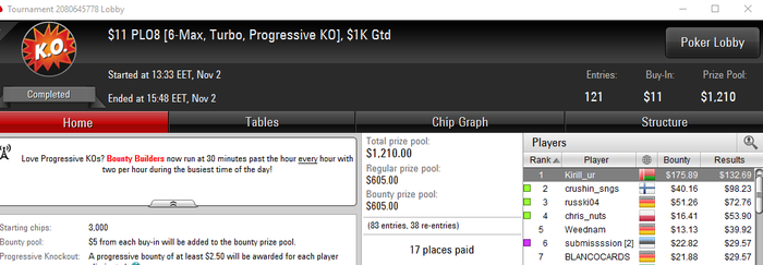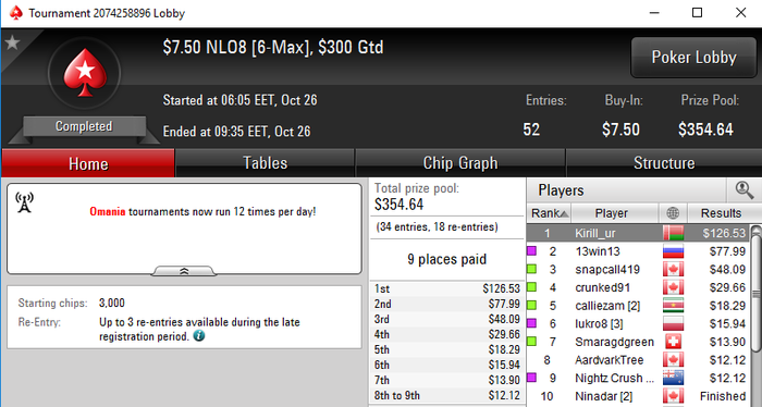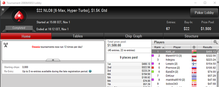 Да, однозначно расписание новое очень хорошее, как это часто бывает остаётся один турнир и он самый дешёвый из загрузки. В топ-3 остановили игру для делёжки, и хотя у меня было на блайндов 10 меньше, чем у ребят - сказал, что делить только поровну буду. Отказались.