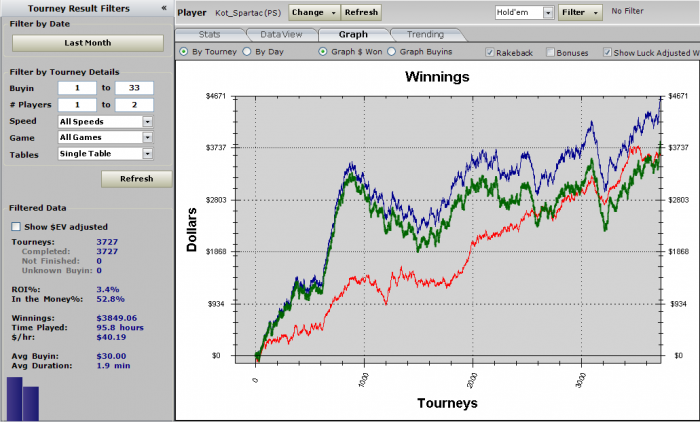 Начал игровой год примерно с Рождества, с банкроллом 400$. Уже начал собирать бекеров, написав " ПАрни, по ходу опять нужна ваша помощь. готовьте деньги на завтра. Если сегодня залью оставшиеся 400$ то начинаем" Но парням не удалось нажить, с этими последними 400$ меня неплохо апнуло и за первую неделю я выиграл +3к на 30-ках. Правда дальше дело пошло чуть хуже, и я начал отдавать свой перебор. Но стабильность по ЕВ радует. В Итоге на 30-ках получилось так: