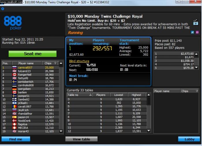 Опять выигрался турнир на 888 в 21-15 за 24$. Это турнир фантом Он никогда не отображается в шаркскопе и лобби с заносом тоже не заскриншотить После окончания турнира всё быстро закрывается и ничего как будто не было. Даже в расписании его нет))) Хорошо хоть деньги настоящии дают!