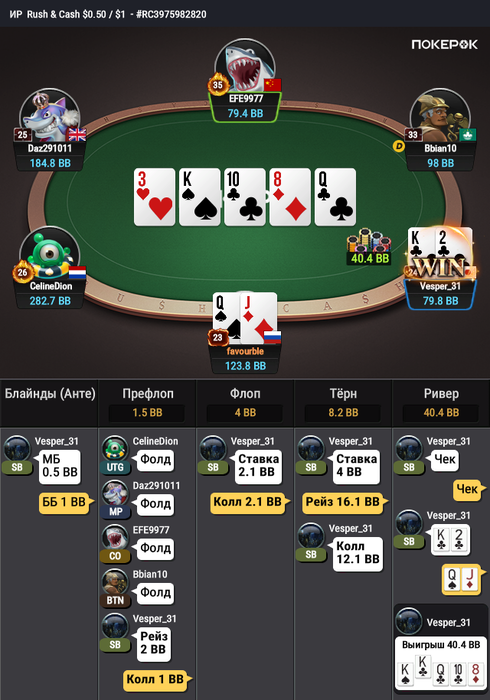 Не повезло с ривером - низко ев-шный ривер, получили меньше стека, ок.