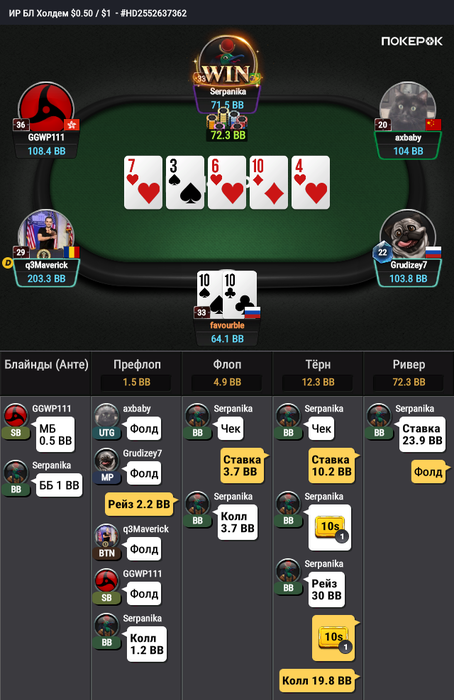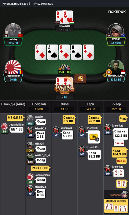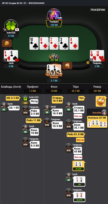 Вот благодаря таким играм я не могу вылезти из минуса. Я подумал что играю против фиша, не посмотрел даже сколько рук оппонент сыграл. Решил фастплеить и мой оппонент тоже так решил)).
