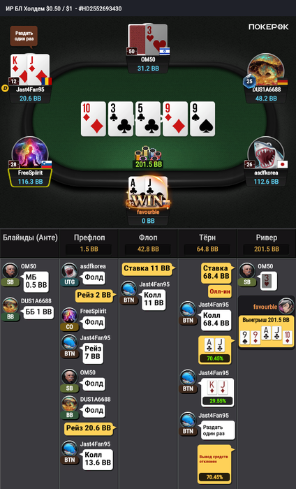 Здесь вот как раз против доминируемого дро поехал. Со стороны оппонента дефолт, хотя я бы КJ префлоп выбросил против себя.