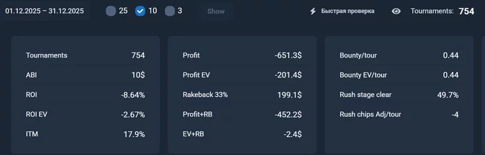 Десятки декабрь уныло. Провели треню, столько косяков на элементарных вещах типа диапазонов рестила или пушфолда с 10бб, прям стыдно что какие то таблички не могу выучить. Поразбираюсь.