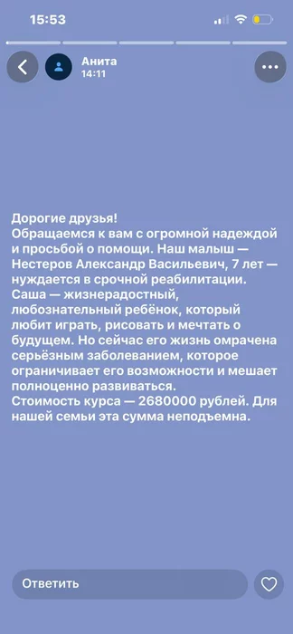В общем, написала она, что друзья попали в ДТП и ребенок у них сильно пострадал. А у них еще два маленьких ребенка (год и два) и работает только отец, сами в деревне живут. Стало прям жалко пацана, немножко решил пособирать помощи. Даже сын из футбольной солидарности пожертвовал свое ежемесячное пособие на пиццу и обещал записать ему видео с поддержкой. Реквизиты и информацию оставлю под спойлером.