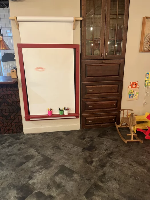 Например, в ресторане отеля висит "бесконечный" рулон с бумагой, на котором дети могут рисовать что им вздумается. Рулон крутящийся, нарисовал - промотал, нарисовал - промотал. Родители ужинают, дети рисуют