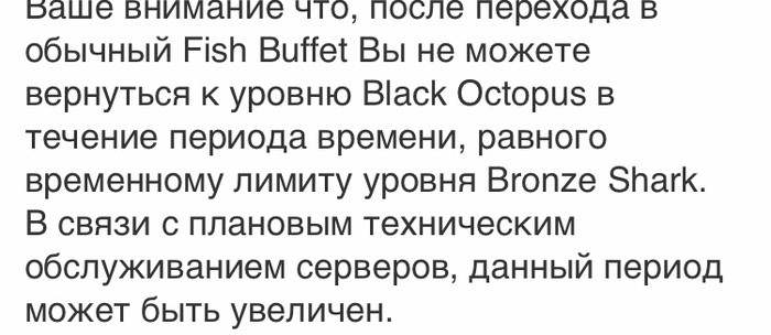 UPD Саппорт ответил. Получается следующее по данным из приложения: 1. До срока окончания фиш баффет остается два дня. 2. До срока перехода из фиш баффет в блэк остается один день. 3. Саппорт пишет, что эти периоды равны и я все равно не успею перейти в блэк, пока не закончится фиш баффет. 4. В связи с обновлениями серверов, они имеют какого то чуда право шатать сроки так, как им нравится - увеличивая их настолько насколько хотят. Общий смысл всего этого высера в том, что при переходе с фиш баффет на блэк мои очки перенесутся в блэк и я получу рейк бэк 50% (в тексте письма они кстати ошиблись в названии куда меня должно отнести согласно правилам). При окончании фиш баффета я получу рейк бек 10%. Получается, что меня нагнули на 40% рейк бека если исходить из данных из приложения (личный кабинет). Да ну вас.