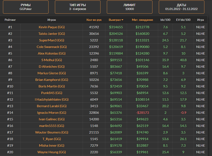 evgenylutay, 7к раздач) Понятно, что он разные лимиты играет. Да я не с тем разгоном говорю, что он плох и т.д. Ему и правда нечего доказывать. Просто, как предположение, что основной доход у человека это не винрейт. И на таких лимитах пожалуй это и норма, так как +8бб, как на скрине на длинной дистанции никто не тащит. А так в любом случай он очень хорош и меня мотивирует - ноль вопросов!