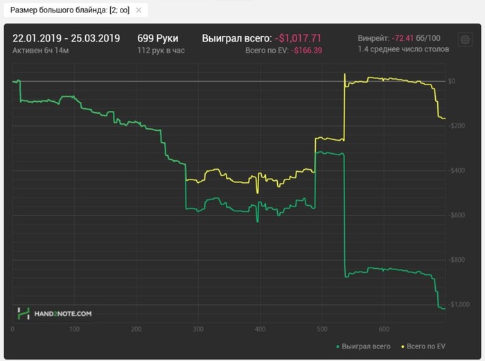 Второй день ловлю себя на отвратительнейшем настроении после казалось бы максимально продуктивного дня. Надеюсь это чисто исключение и дальше будет получше. Сегодня по ощущениям было много не лучшим образом сыгранных раздач. На завтра задание будет больше контролировать качество и количество столов