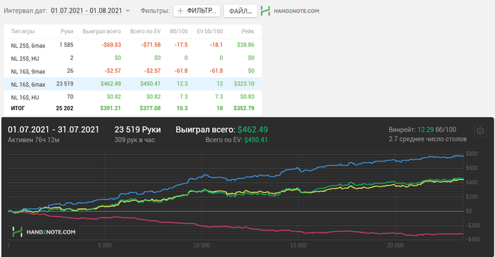 2. ДИСТАНЦИЯ. Всё-таки пора признаться себе, что 20-25К рук в месяц - это тот максимум, который я могу себе позволить. В этом месяце я катал максимально как позволяло время, так что не стоит строить иллюзии о 30-35К рук в месяц - лишнее расстройство и подсознательное, что цель не выполнена. На данный момент эта цель просто недостижима для меня.