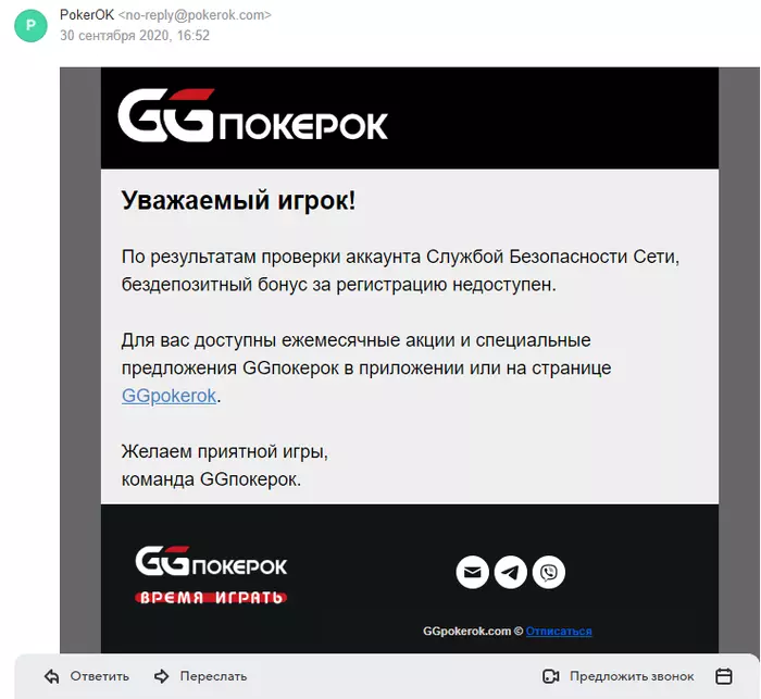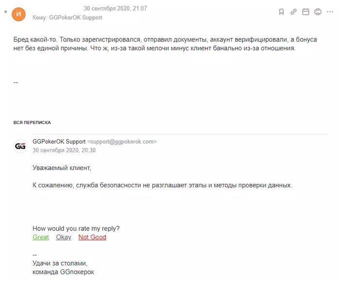 Поделюсь мелочным скамом от Покерка ещё из сентября 2020. Тогда обещали бездепозитный бонус 11$ за регистрацию. Собственно, зарегистрировался, верифицировал аккаунт, бонуса нет. Написал в поддержку – ответы ниже. Никаких нарушений от меня быть не могло, так как узнал о существовании онлайн-покера лишь за несколько недель до регистрации, и это был мой первый или второй рум, в котором зарегался. Наверняка с подобным столкнулся не я один. Так что и с привлечением любителей у них бывают проблемки.