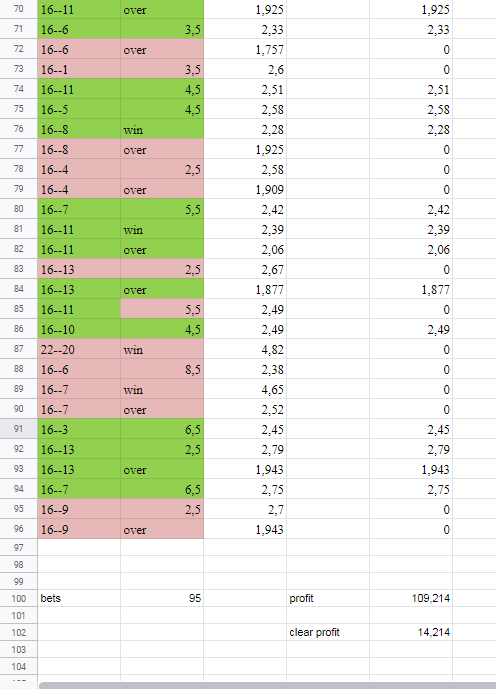 Алгоритм тоталов остался, а точнее ее концепция. Пока шла эта карусель, в процессе матчей по доте, решил применить эту концепцию на КСе. Накидал десяток матчей, с уже известными резалтами, сделал откат информации до матча и прогнал. Получилось вроде неплохо и стал дальше рыть. Работа очень трудоемкая, всё в ручную да и ладно если до матча . А ведь надо еще откат делать, чтобы информация была достоверная. Я сразу знал, что КС обычными кэфами не победишь, нужно брать 2++. на 2++ выходили только форы ну или победы андердогов. Остановился только на форах, в том числе и догов. по ним и работал. Но по итогу зачастил счет 16-14 и терялось прилично на этом. Разница переворота дога в 2.5 фору примерно 0.4. Но таких случаев было прилично, поэтому отказался от форы догов и перешел на победу догов.