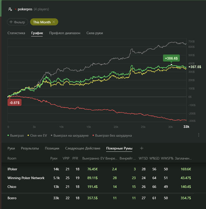 Мысли насчет того, где буду играть. Оставляю WPN и Chico (столы зачастую 1-2 рега, 2 всратых фиша впип 40+ и один нормальный впип 60+). Играть редстар не нравится на данный момент т.к из-за составов 4-5 агрессивных регов с трибетом больше 11 плюс 1-2 норм фиша цена ошибки, начиная с префлопа, довольно сильно возрастает, игра больше похожа на зум. Играть редстар с расчетом получать около половины профита рейкбеком, мне чисто психологически тяжеловато, хоть и рейкбек там предлагают хороший. Я графики люблю с двузначным винрейтом) Редстар подключу, когда буду уверен в своей игре.