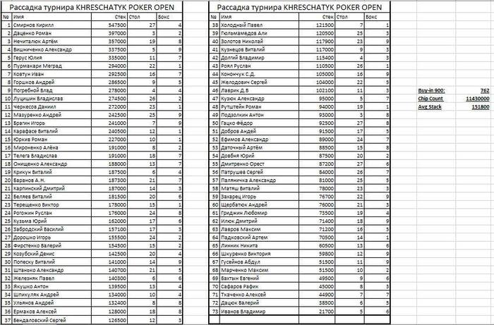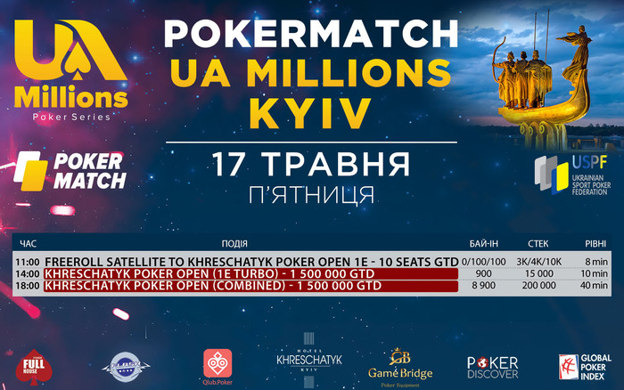 Программа на пятницу, 17 мая Сегодня рабочий день на нашей серии начнется в 11:00. В это время стартует заключительный фриролл-сателлит к турниру Khreschatyk Poker Open (1E) В 14:00 начнется турбо-флайт Khreschatyk Poker Open (1E) А в 18:00 начнется комбинированный день этого турнира, в который перейдут все игроки, успешно преодолевшие отборочные дни. На этой стадии вступить в турнир можно будет за 8900 гривен и получить стек 200 000 фишек! Гарантия турнира Khreschatyk Poker Open - 1 500 000 гривен! Удачи всем!