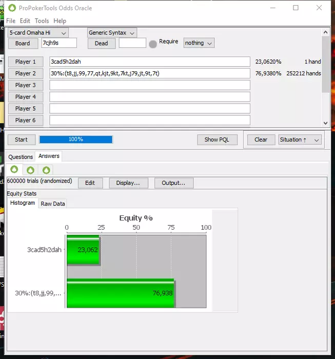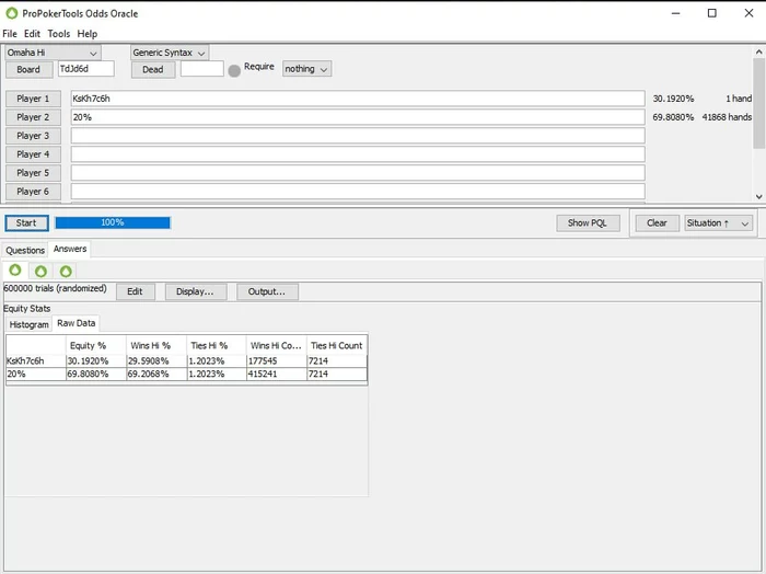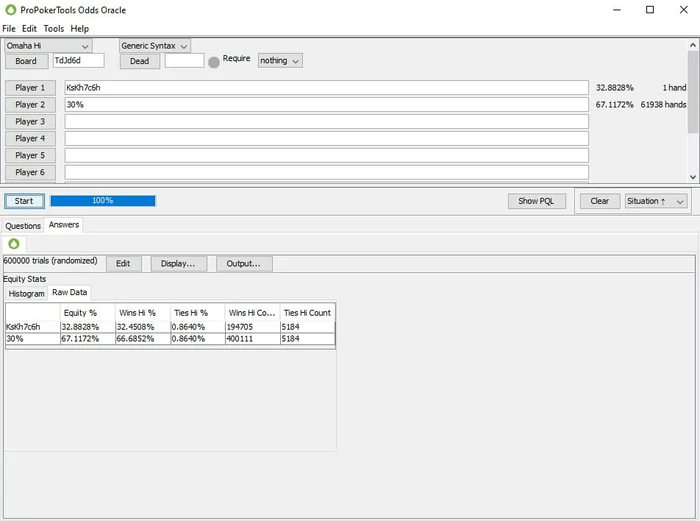 если мы задаем оппоненту диапазон 20% и 30% программа показывает что наше эквити против такого диапазона 30-33%, а нам для нулевого колла нужно 29% эквити. но также как справедливо заметили, это упрощенный расчет, можно начинать с префлопа откидывать часть рук которые фолдят и которые 4 бетят, потом на флопе откидывать руки которые фолдят. плюс тогда мы должны считать не просто наше выставление против диапазона, но и с учетом ев фолдов ... вряд ли это точно кто то не посчитает.
