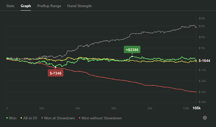 По итогу меня просто заебала вот эта вся хуйня. Ты в руме просто как будто в бетонную стену долбишься из регов, ботов и полуфишей у которых рука всегда лучше, чем у тебя. Я понимаю, что топ гриндеры которые гриндят на статус King зарабатывают и будут зарабатывать в этом руме за счет просто огромного рейкбека, знаний как наебать ботов и еще хуй знает каких скиллов. Но я понимаю, что я катаю эту хуйню в вечном полутильте без всякого удовольствия с почти нулевым эффектом. Поэтому с этим румом я прощаюсь, по крайней мере на ближайшее обозримое будущее.