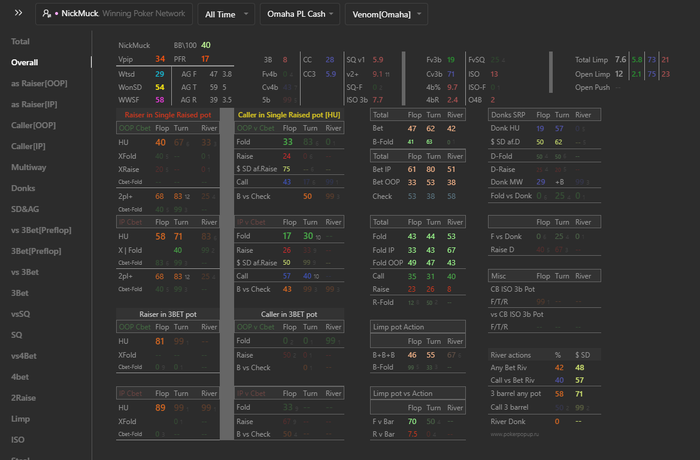 Откатал на WPN (Pokerking) почти 150к рук. В текущем году примерно 105к рук в основном пло 100, пло 200, немного пло 400 и совсем мало пло 600. Почти вся дистанция в 4 карты, 5 карт подключил в руме относительно недавно. Не играл столы там где закупка с коротким стеком (Shorts, 40бб закупка), не играл столы где не можешь сняться в течение 7 дней если не обнулился там (7 Day No Rathole, 20бб закуп - и набиваешь до бесконечности, пока не сделаешь 7 дней перерыв), почти не играл 4 макс столы. Бомб пот столы, 9 макс столы, NL омаху играл.