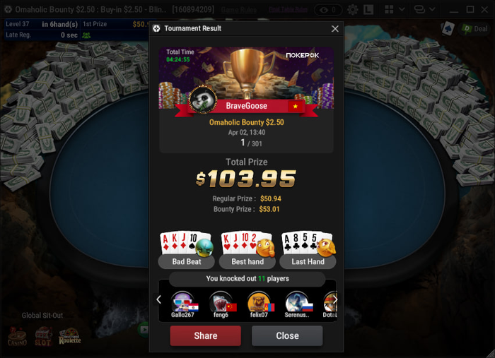 Еще чуток про покер. На прошлой неделе обнаружил неизвестно откуда взявшиеся 5 турнирных баксов на Покерке. Зарядил в батл рояли и турик PLO за 2,5.