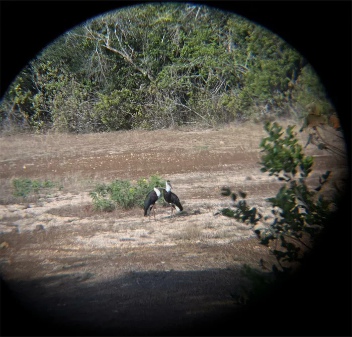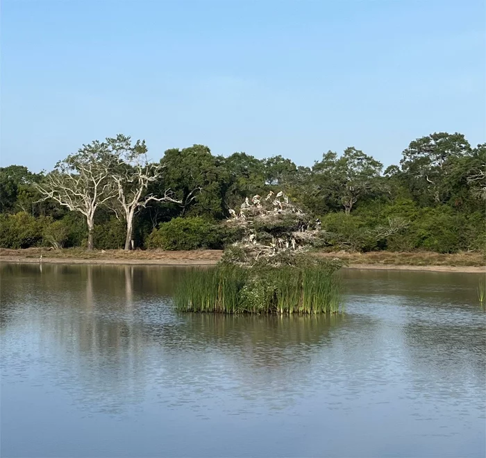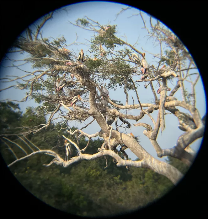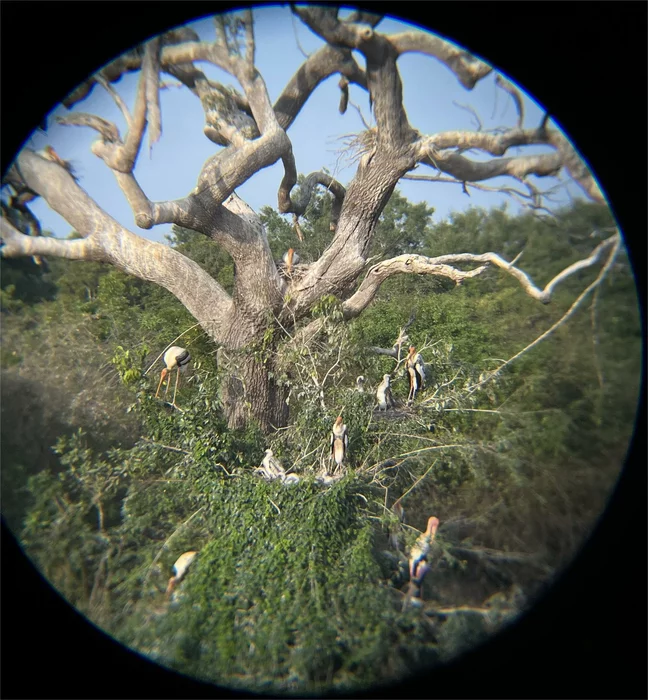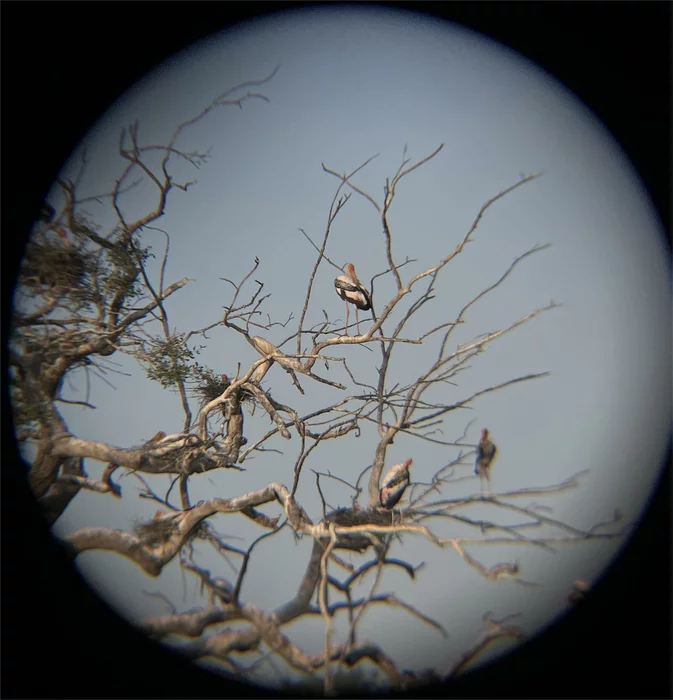 Гигантская стая марабу (мы их так окрестили, но на самом деле это индийские клювачи) на первой точке маршрута. Их, наверное, было больше сотни: больших и маленьких, с черными крыльями и полностью белых, грациозно летающих и хлопотливо укладывающих в гнезда подхваченные палки.
