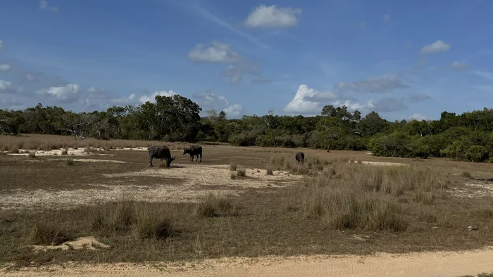 Во-вторых, я забыл написать про двух диких буйволов. Они с самого начала тоже были на водоеме, слева с краю от нас. И на протяжении всего этого спектакля неспеша двигались по противоположному берегу. Была надежда, что они привлекут внимание крокодила, но он тоже не дурак против двоих выходить. Да и в целом такая дылда ему не по зубам во всех смыслах.