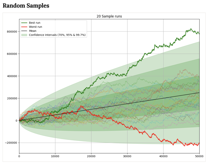 Судя по https://www.primedope.com/tournament-variance-calculator/ даже для скромного БИ 100$ на АФС 500 и РОИ 5% нужен банкролл 200.000$, чтобы вероятность его потерять была ниже 1%. И то, только ЕСЛИ лимиты не повышать вообще и ЕСЛИ профит не выводить вообще. А если повышать или все что выше выводить, то даже с 200к$ разорение будет неизбежно на дистанции. Стрики могут быть больше 3000 байинов даже если мы наверняка знаем, что рои положительный. Да, если РОИ будет 15%, а не 5%, то всё будет сильно лучше, но давайте радоваться хорошим исходам по факту, а не расчитывать на них заранее.