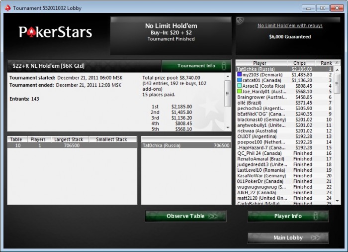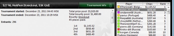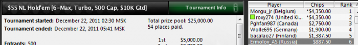 Сейчас играю утренние-дневные сессии. Сегодняшний итог "Вы заняли на турнире 4 место. Сумма в размере USD 1 107,00$ " Пока доволен игрой, которую показываю, не смотря на то, что очень не складывается в концовках. Например, в этом турнире начиная с предфиналки не мог ничего выиграть по руке(ещё и приходилось много хиро фолдить), но удавалось много забирать без вскрытия и восстанавливать стэк. Правда в следующее воскресение на столько выгодные турниры, что пропустить их я не могу и видимо придется временно перестроится на ночной образ жизни.