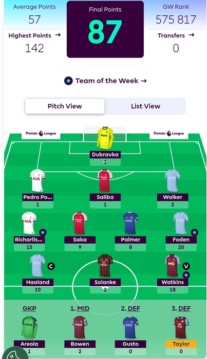 Вряд ли можно было больше набрать, но уж как есть. Где-то повезло (Ассист Уокера, пол тайма от Салаха), где-то недобрал (Жота, Салах). Многие трипл-капитанили Халанда - ошибка, которой мне удалось избежать.