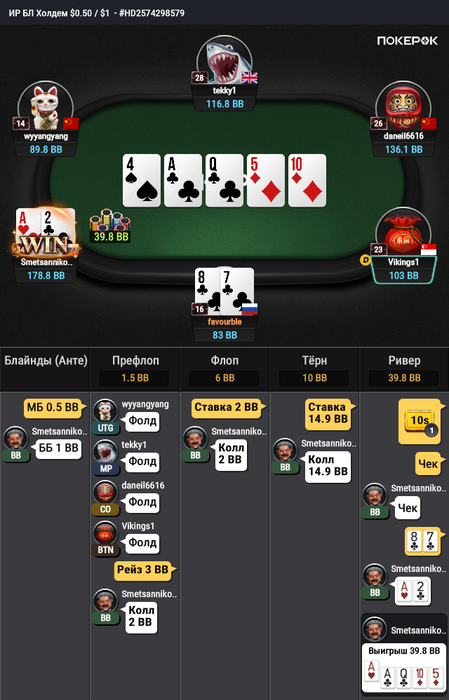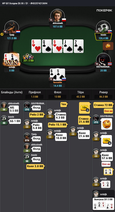 Я понимаю в моменте кажется " О ну тут только флеши, сеты ни одного блефа, кол в суперминус", но я думаю моя рука или нулевая или слабоплюсовая.