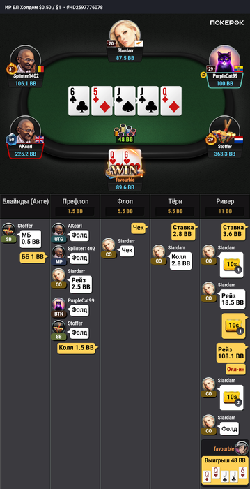 Ривер: Тут сложно. Оппонент думал долго и нажал колл. Да он смог придумать мне блефы и он их увидел. Но честно тут сложно достаточно блефовать без позиции.