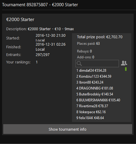 Что касается меня тоже пару слов напишу. Есть же поговорка. Под лежачий камень вода не течет. Или Вода камень точет. Это к чему я вспомнил, а к тому, что Алтын серебра не ломит ребра только в случаях, когда это все происходит. Единственное, о чем я сожалею, так это о том, что не понял это (в покере, но не в других сферах) относительно поздно. Сейчас я нахожусь в хорошей форме и очень рад тому, что год, а точнее его последний день закончился позитивно!