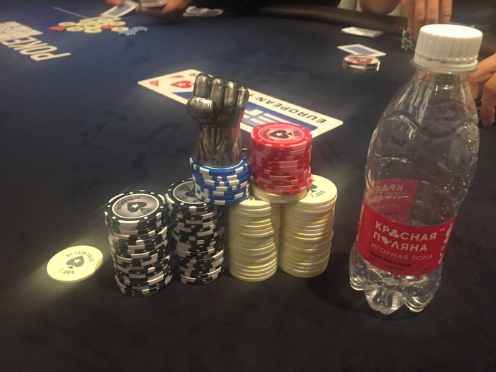 Вчера после раздачи с Дукалисом почти весь день сидел с 15-23бб, удавалось находить выставление 70/30+. Потом с 23бб попал за стол к фишам. Получил одно окно для стила блайндов с , забрал и дальше без вскрытия с 25к до 100к подошёл к важному кулеру