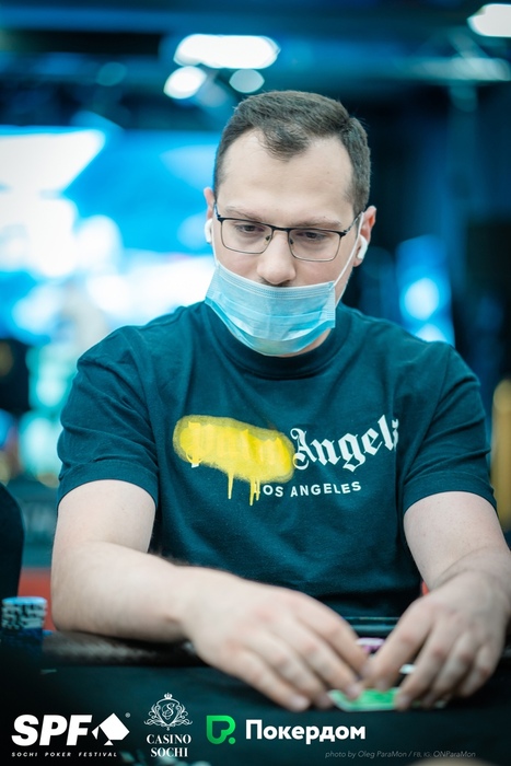 Бурно возобновился турнир. Алексей Крылов защитил большой блайнд от Вадима Липовки (UTG+1), сыграл чек-колл флопа и донк пуш тёрна . Вадим заколлировал с , Крылов показал .