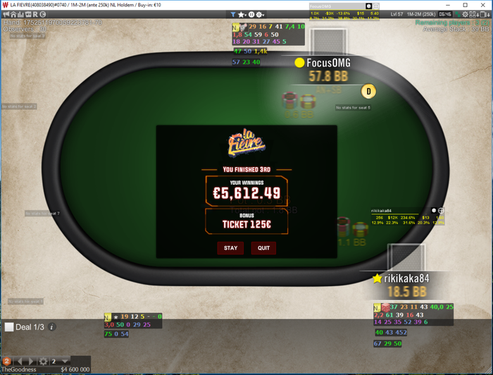 Вышел на финалку девятым, с 10 бб Крутился как мог. Стэк ни разу не был больше 17бб на финалке. 3 место - ок. Проиграл бразильцу А9в А6 префлоп крайнюю((