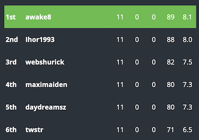 awake8 не просто попадает в призовые очки во втором турнире из двух, но выиграет его, получая тикет 11 евро по АПЛ (будет начислен вместе с лидербордом, то есть в конце месяца).