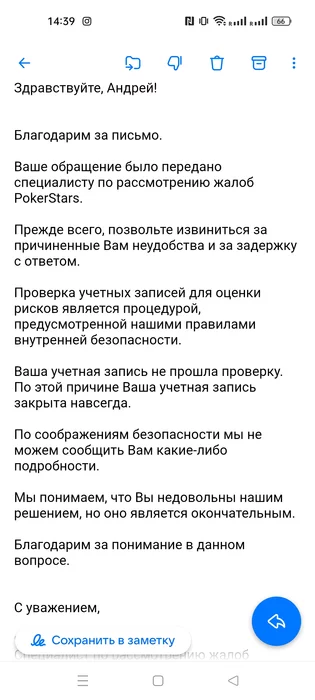 Скорее всего выиграл много) минусовых не банят. К сожалению наши права крайне ограничены перед покер румами. При регистрации мы соглашаемся на то, что их любое решение конечно и неоспоримо. Куда я только не писал письма, по поводу бана на ПС. Даже ездил на серию в Прагу, разговаривал с менеджерами. Никакого эффекта.