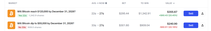 Могут сложиться обстоятельства, при которых биткойн будет находиться в диапазоне 55–120k весь год и так его и закончит. В таком случае будет плюс по ставке NO 55k и ниже и минус по ставке YES 120k+. Поэтому убыток по одной ставке (120k) будет частично — а возможно, и полностью — скомпенсирован профитом по ставке на 55k.