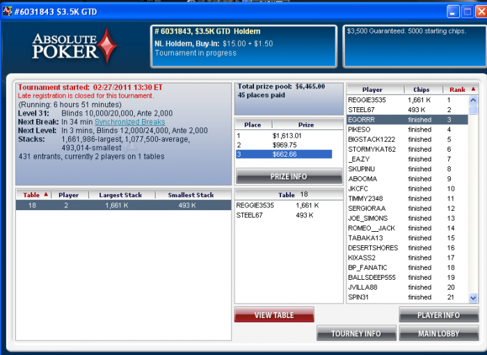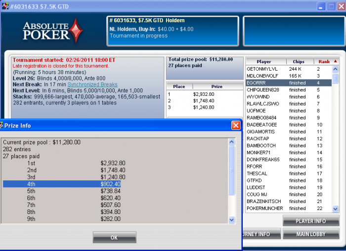 Absolute Poker No Limit Hold'em Tournament - t15/t30 Blinds - 9 players - View hand 1201093