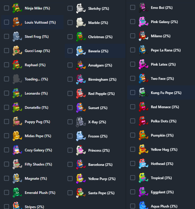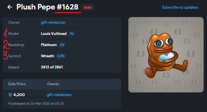 2. Каждый подарок после конвертации в NFT превращается в один из примерно 40-50 уникальных моделей. Наведу пример с жабкой пепе. Каждая модель отличается по редкости. То-бишь есть более раритетные и менее раритетные модели.