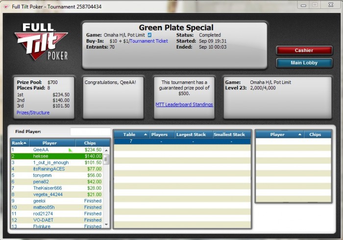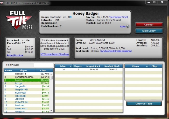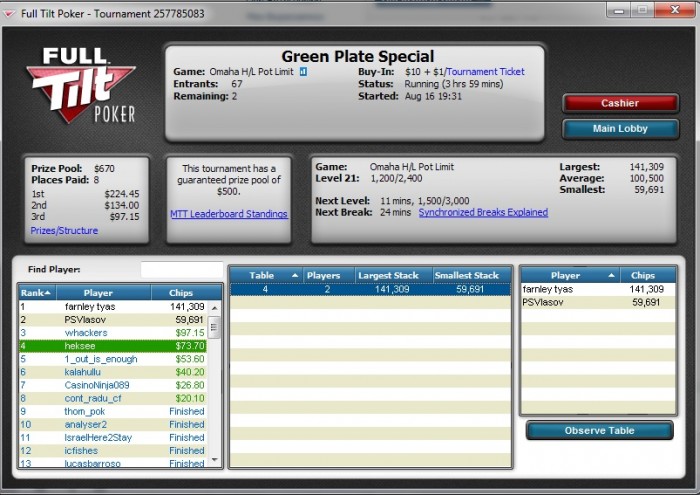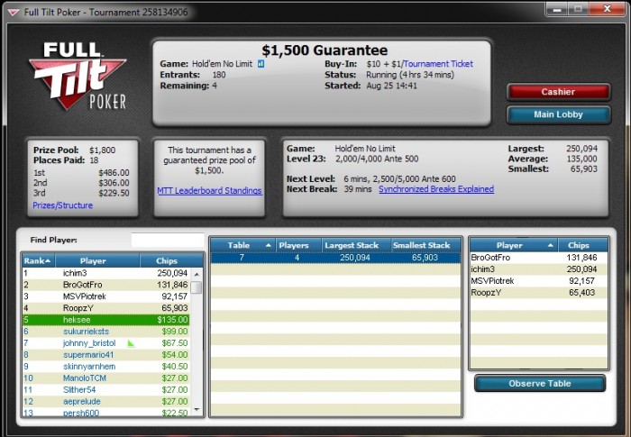 Full Tilt, 4,000/8,000 blinds, 1,000 ante No Limit Hold'em Tournament, 4 Players