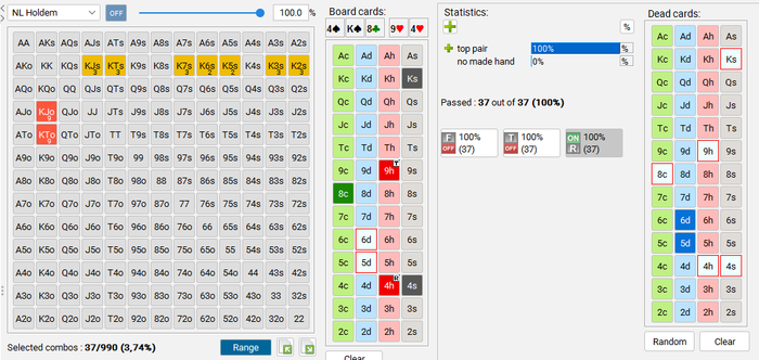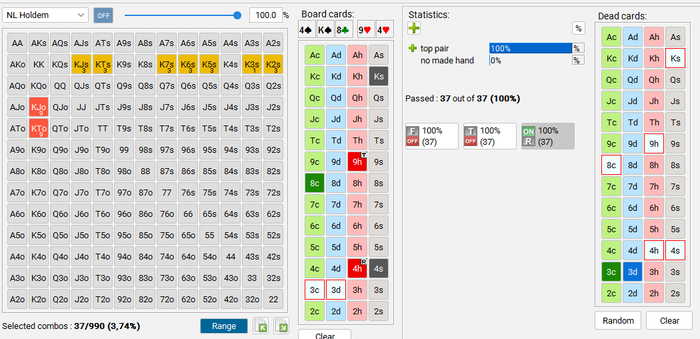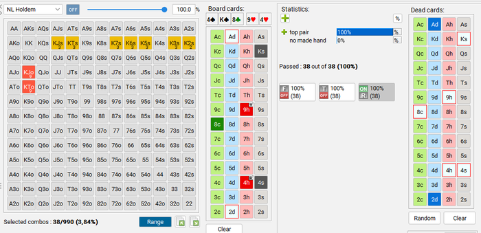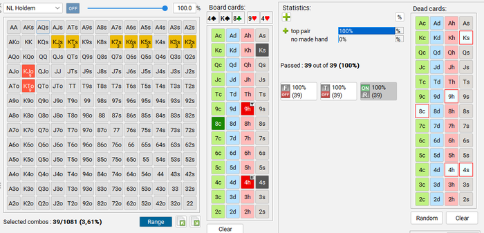 Хотим снести ему голые топ-пары KJ-K2. Их 39 штук. Без заморочек с его 3бетами. Считаем что они все коллом сыграли префлоп.