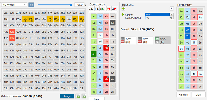 Имеем JTs на руках. У оппа 33 комбы для фолда.