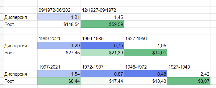 Второе деление (на трети). 1927-1956 и 1956-1989. Рост увеличился, диспа сократилась. Пока полное совпадение с первым делением. 1989-2021. Диспа внезапно снова стала расти. Рост всё так же увеличивается. Так, с дисперсией закончили, тут рандом. Но может, раз два раза из трёх совпали по росту, то тенденция найдена? Для этого делаем следующее деление.
