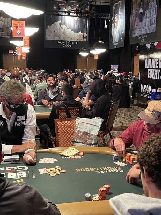 Прогуливаясь по главному залу нашла стек 169к, который растаял до 45к. Это было перед ужином 3-го дня. Участник по какой то причине просто не пришел((