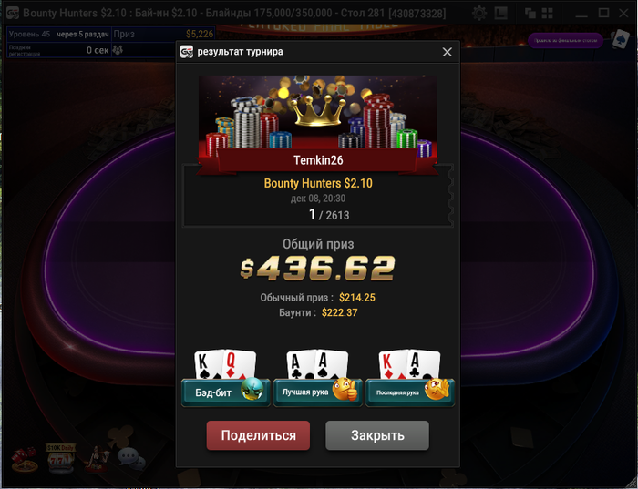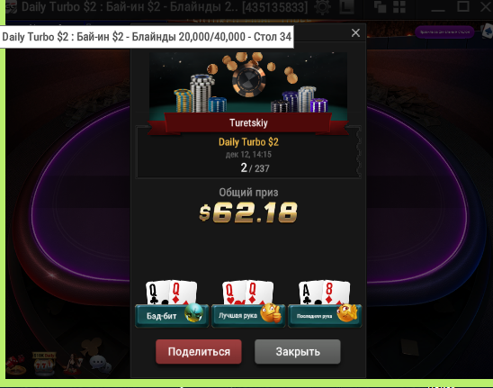 Решил поучаствовать на PS в килополяне Билдера. Отобрался через сателлит за 8 центов. В течение турнира были важные выставления(все сверху), но не все тащились. Старался играть по карте, лака не заметил. НО. На финалке не затащил главное выставление. Именно мне раздали КК, а чипаку- АА. Итог- 9ое место.