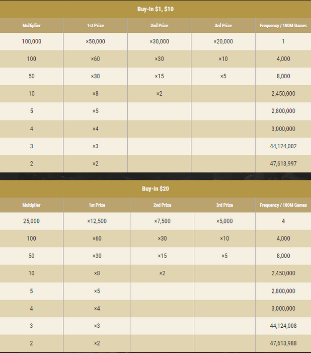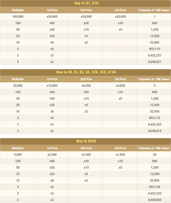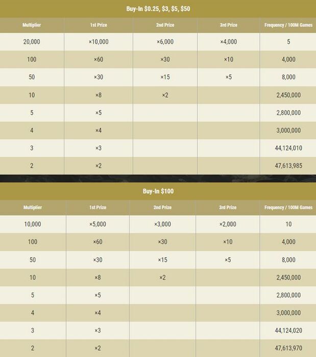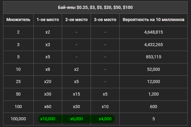 После последнего обновления ПокерОк изменил систему множителей в спинах, поэтому статья утратила свою актуальность. Кроме того, в ней есть ошибка. Максимальный множитель на лимитах 0.25, 3, 5, 20, 50, 100 - х20 000. Джек х 100 000 только на лимитах 1 и 10. Схема выплат везде одинаковая: 1е - 50%, 2е - 30%, 3е - 20%.