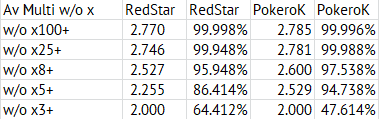 Я писал недавно о методе для анализа достижимости среднего множителя, поэтому повторяться не буду. Сразу к результатам сравнения. Ах, да. На покерке разное распределение множителей для разных лимитов. Но можете сами проверить, это не влияет ни на средний множитель, ни на его достижимость. То есть вообще никак. Не знаю зачем там разное распределение.