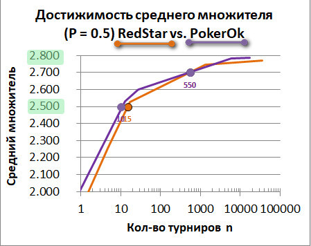 С вероятностью 0.5 средний множитель на покерке будет 2.5 за 10 игр, тогда как на RedStar за 15. А вот за вероятность получить ср.множитель 2.7 надо будет сыграть одинаковое кол-во игр - 550.
